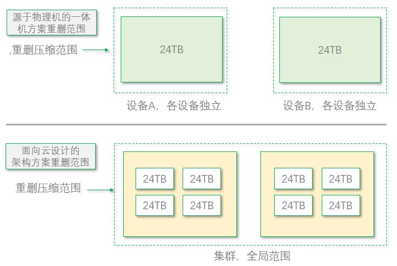 对于高度重复的云化数据中心来说,备份系统具备集群范围的消重压缩能力,是一个关键指标,一些情况甚至高达90%的重复比例。如果用传统的方案,会投入数倍的成本来存储重复的数据。对于一些数千个云节点的大规模云平台,这将是巨大的投入。