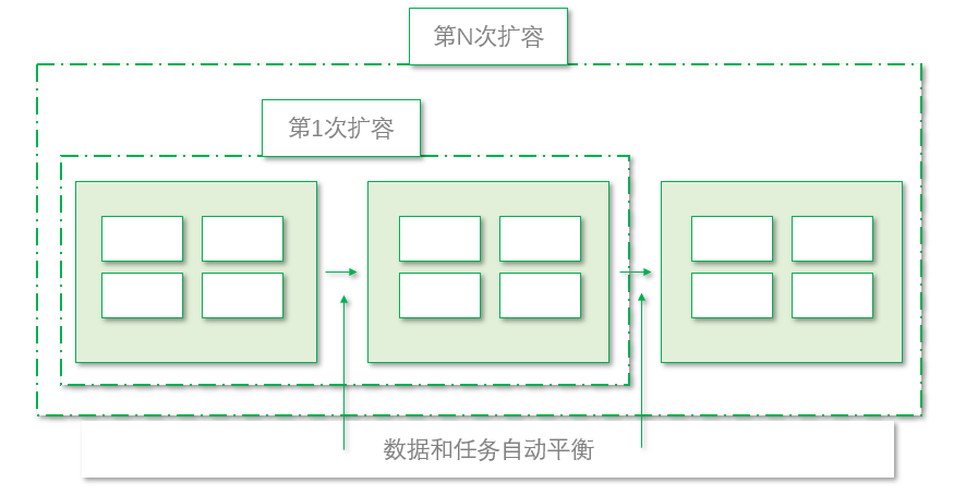 应云而生的是Scale Out 的横向扩展模型。简单来说,就是一组一组地扩展,而组与组之间可以无缝融合成一个大组。所有组内的服务器节点数据都是共享的。另外,系统也能自动平衡内部的数据和任务分布。数据存储和任务处理性能,同步提升。