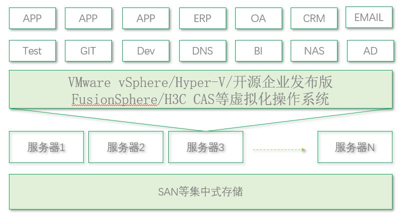 这种方案是目前最主流的云化数据中心方案,主要采用的方案就是虚拟化操作系统、服务器与企业级集中式存储,该方案成熟度最高。这种方案,随着虚拟机规模增加,底层的集中存储会越来越感觉到不够用。这时候需要增加新的存储或服务器部署,重新迁移或分布虚拟机系统。
