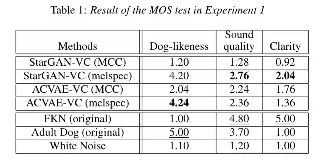 任务的输入是人声音频,输出是合成的狗叫音频。数据音源中,包含503段人类的声音,自收集了成年犬792段和幼崽288段叫声。论文采用音频合成领域经典的StarGAN和ACVAE作为benchmark,并设计了三个主观定性指标:输出音频和狗叫声的相似度,音频质量,声音清晰度;还有一个量化指标,角色偏差程度用于评估模型的效果。目前为止,benchmark在测试中遥遥领先。