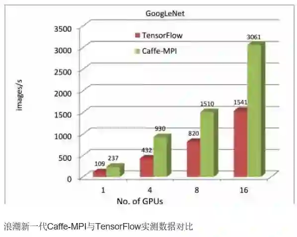 针对上述情况,浪潮发布了集群版的Caffe版本——Caffe-MPI,并在GitHub上开源公布所有代码,以此为客户提供更强大的深度学习平台。根据浪潮提供的官方数据,使用GoogleNet模型,在不同GPU数量的情况下,对比每秒处理图像的速度,Caffe-MPI几乎是TensorFlow的两倍。
