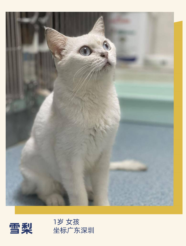 救助故事:雪梨是小区凭空出现的小猫咪,非常的亲人无攻击性自己那双不寻常的眼睛都透露出它是被人抛弃的小猫咪,最近雨季将近,这种猫咪肯定不适合流浪生活,希望能有爱心人士不离不弃给予雪梨稳定的家庭生活。