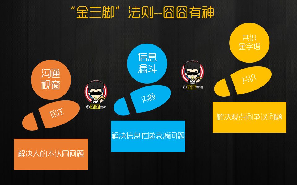 有效沟通包含最主要的三个关键步骤:信任、沟通、共识,也即个人总结的“金三脚”法则: