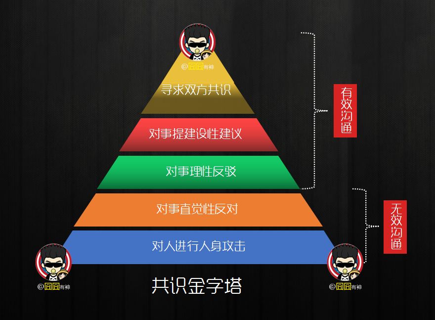 所以我们来看这样一个金字塔,一共有五级,最下面两级属于【无效沟通】,上面三级才进入了寻求共识【有效沟通】的范围内了。