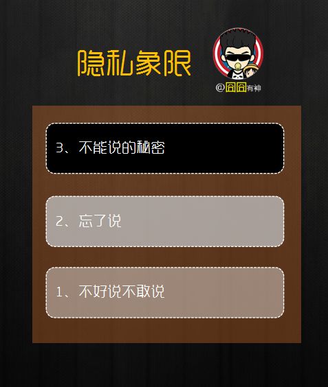 每个人都会有一些又黑又深的秘密,它是人们内心的安全禁区,一旦越界,会给自己带来伤害,这边我就不举例子了,每个人心中都有自己的一杆称,尊重别人心底的隐私也是符合人性的。