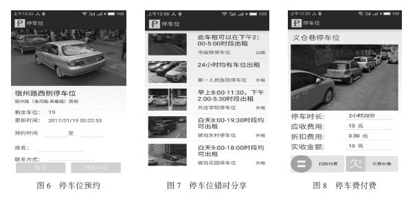 城市智慧停车系统首先采集各个停车场和停车位信息,并且将其发送到信息处理中心服务器,用户通过智能手机的客户端APP访问数据库,进行停车位的查询、预订、错时分享、导航等功能。主要功能如图 3—图 8所示。本文城市智慧停车系统基于Eclipse平台进行Android客户端开发,采用Tomcat服务器处理网络请求与响应,数据库的建立采用MySQL,停车位路线导航与地图服务通过调用百度地图Android SDK API接口实现。