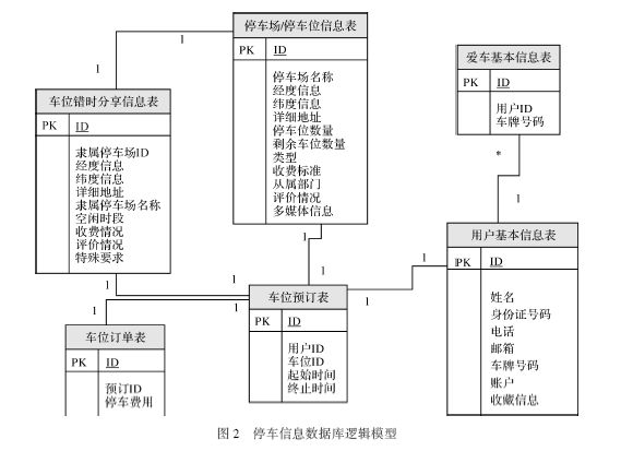 实时动态更新的停车位数据是“互联网+”城市智慧停车的保障。停车信息数据库存储停车场和停车位信息,以及车位查询、预订、停车、驶离和付费等过程中生成的静态和动态信息数据。主要包括用户基本信息表、停车场/停车位基本信息表、车位错时分享信息表、车位预订表、车位订单表、爱车信息表和爱车服务信息表,逻辑模型如图 2所示。其中,动态停车位数据可以根据手机APP车位预订结果实时更新,也可以根据停车场的设施条件获得,如停车场内的红外线检测器、视频检测器等硬件设施及停车场入口的计数器上传车位动态数据,甚至可以人工更改停车位信息,手工上传空余车位的位置和数目信息。