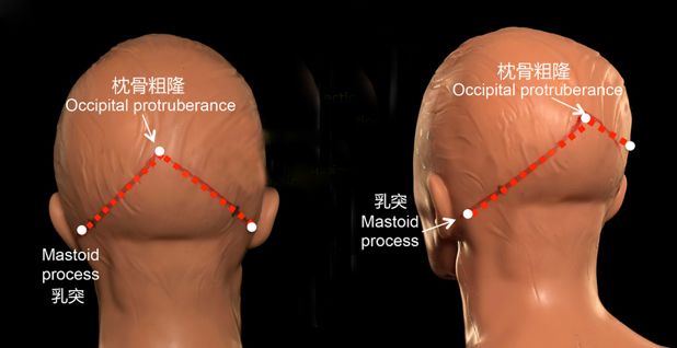 眉间的位置很好找,但是枕骨粗隆又在哪里呢?用手摸自己的后脑勺,中间最凸出的那个点就是枕骨粗隆。如果你正视前方,慢慢地将头靠在墙上,枕骨粗隆是后脑勺最先碰到墙壁的地方。