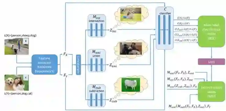 为了研究上述课题,我们在 2019 年 6 月举行的 IEEE 计算机视觉与模式识别(CVPR 2019)大会上发表了相关论文,对多标签、小样本图像分类进行了研究。本论文题目为《LaSO:面向多标签小样本学习的标签设置操作网络》(「LaSO:Label-Set Operations networks for multi-label few-shot learning」,论文地址:https://www.research.ibm.com/artificial-intelligence/publications/paper/?id=LaSO:-Label-Set-Operations-Networks-for-Multi-label-Few-shot-Learning),提出了一种训练深度神经网络的新方法,即将图像样本对与一定的标签集相结合,合成具有「合并」标签的新样本。例如,考虑图 1 中的两幅图像,一幅描绘的是「一个人遛羊和狗」,另一幅描绘的是「一个人抱着一只狗和一只猫」。第一张图片的标签是「人」、「羊」和「狗」,第二张是「人」、「狗」和「猫」。通过给定的这两幅图像,LaSO 网络合成了新的训练样本,这些样本通过对标签执行联合、交叉和减法操作而产生。「联合」生成了一个标有「人」、「狗」、「猫」和「羊」的样本,「交叉」和「减法」生成了分别标有「人」、「狗」和「羊」的多个样本。LaSO 网络直接在深度神经网络学习的特征空间进行操作。