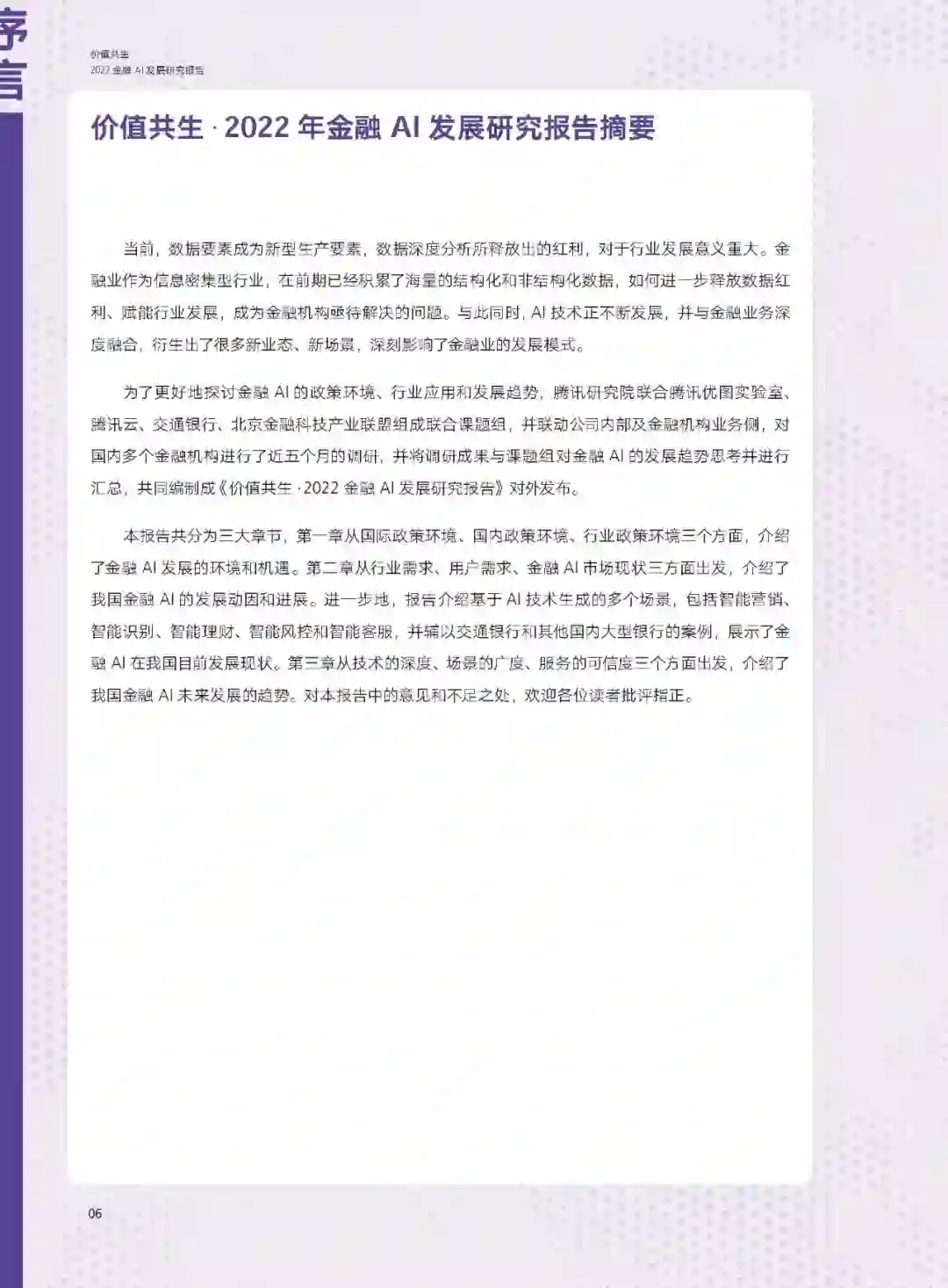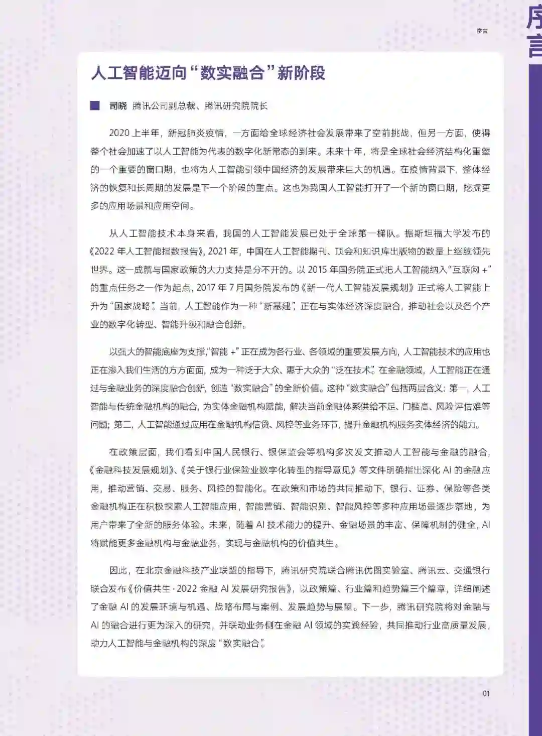 9月3日,2022世界人工智能大会腾讯论坛上,腾讯发布国内首份金融AI白皮书——《价值共生·2022金融AI发展研究报告》(以下简称“报告”)。报告由北京金融科技产业联盟作为指导单位,由腾讯研究院与腾讯优图实验室、腾讯云、交通银行组成的联合课题组,联动腾讯内部及金融机构业务侧,对国内多个金融机构进行了近五个月的调研,并将调研成果与课题组对金融AI的发展趋势思考进行汇总,共同编制而成。