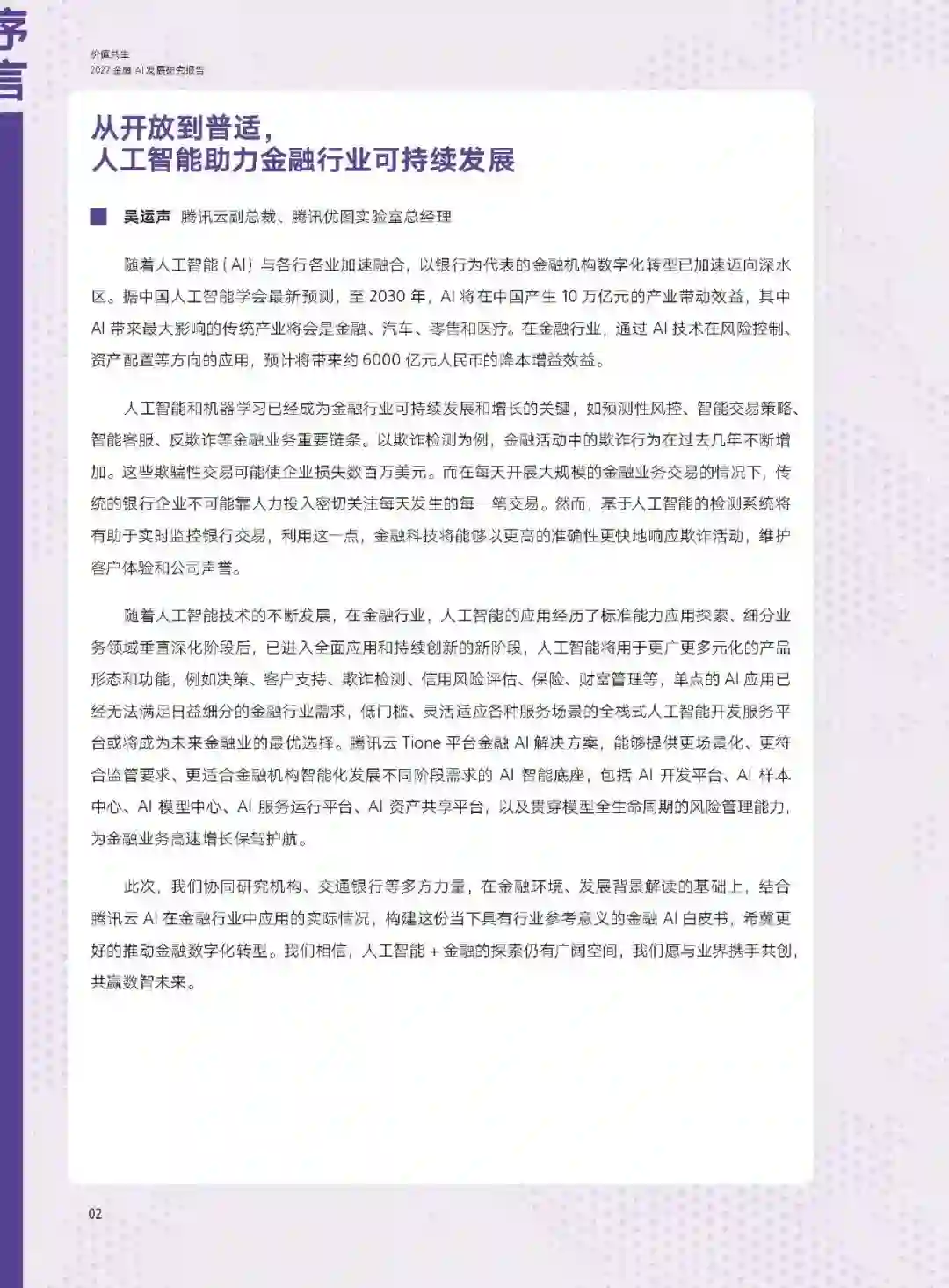 在报告发布现场,腾讯云副总裁、腾讯优图实验室总经理吴运声表示:“人工智能和机器学习已经成为金融行业可持续发展和增长的关键。随着人工智能技术的不断发展,在金融行业,人工智能的应用经历了标准能力应用探索、细分业务领域垂直深化阶段后,已进入全面应用和持续创新的新阶段,人工智能将用于更广更多元化的产品形态和功能。我们相信,人工智能+金融的探索仍有广阔空间,我们愿与业界携手共创,共赢数智未来。”