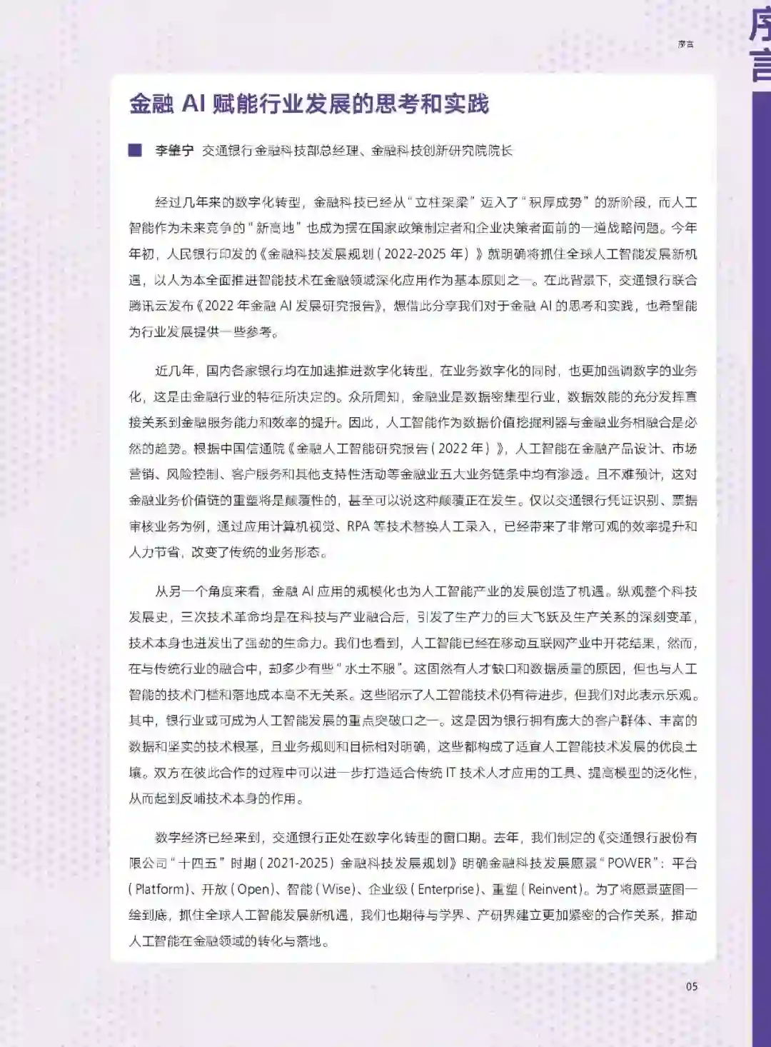 人工智能作为一种“新基建”,正在与实体经济深度融合,推动社会及各个产业的数字化转型、智能升级和融合创新。报告指出,近年来,人工智能技术正不断发展,并与金融业务深度融合,衍生出新业态、新场景,深刻影响金融业的发展模式,同时也为金融服务夯实“安全底座”。