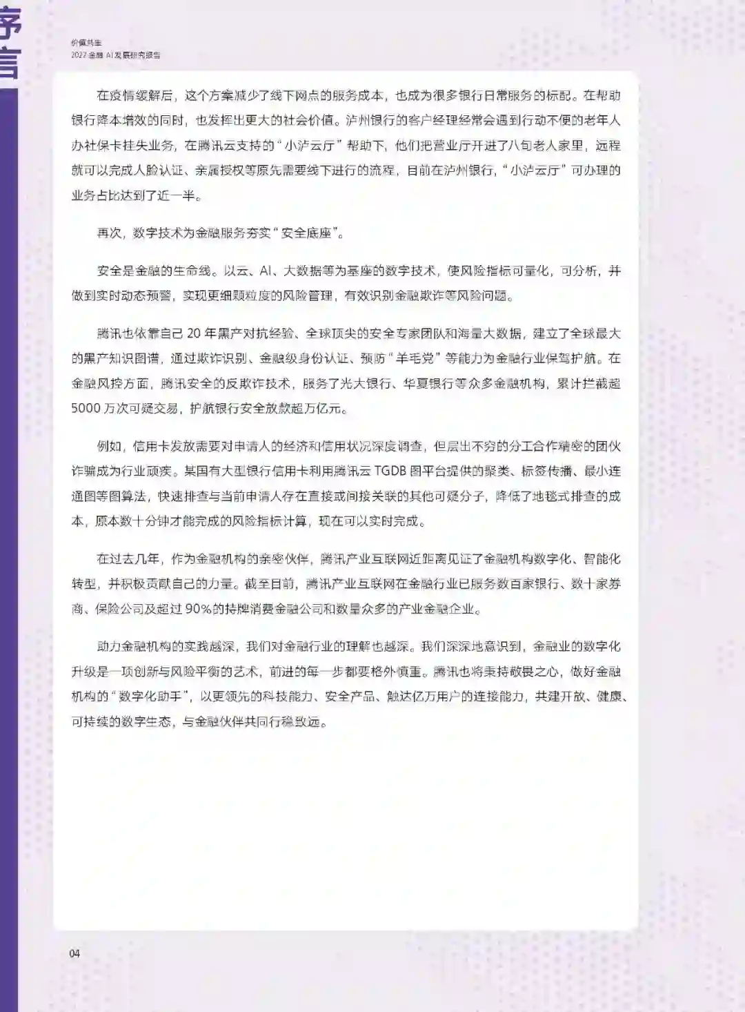 在行业层面,AI赋能智能金融场景创新,金融服务能力不断提升。在AI与金融的加速融合下,催生出了智能营销、智能识别、智能理财、智能风控、智能客服等多种提升金融价值的场景。报告通过这五个场景和五个案例,展示了金融AI在我国目前发展现状。以交通银行融合了计算机视觉、机器学习、人工智能等新技术的“统一图像识别平台”为例,腾讯优图通过引入多模态技术提高信息抽取的泛化性能,助力解决非标准文档的OCR信息结构化提取,提高图像、单据识别率,推动业务效率以及用户体验提升。同时,该平台在信息录入等方面时长降低98.4%,且准确率高,能够大量节约人力成本。