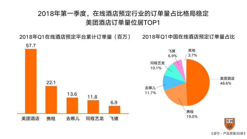 接着看这张图,是2018年的一季度,美团酒店的在线订单,超过了携程系的总和,将近占到了这个市场的49%。