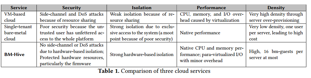 虚拟化是云计算的基石,多租户(Virtual Machines)共享一个物理服务器,提高了数据中心服务器的利用率,使得云计算服务商可以提供更经济高效的服务。但是,虚拟化下多VM共享物理服务器的技术会引入不少安全问题,尤其是最近的侧通道攻击等。此外, CPU、内存和 I/O 在虚拟化性能方面会产生不可忽略的开销。为此,物理服务器租赁已成为公共云中新兴的服务类型,物理服务器租赁为用户提供了强大的隔离性、对硬件的全面和直接访问以及更可预测的性能。但是物理服务器租赁的方式也有其缺点:它只能针对单租户,且不具备可扩展性、成本又高,适应性弱。当前物理服务器租赁只能将整个物理服务器租给单个用户,并且在租用服务器后用户无法方便的替换镜像,存储等云计算的基本服务。