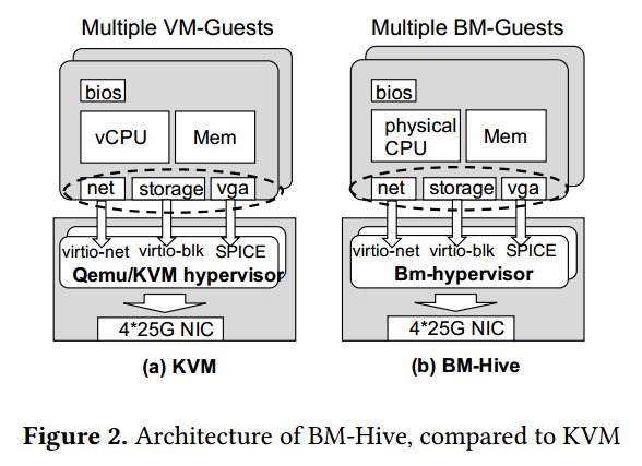 神龙裸金属软硬一体虚拟化架构是对现有虚拟化的一个自然演进与升级换代。入下图所示,在整体架构上面,BM-Hive与传统虚拟化方案在CPU/内存方面、运维体系接入、多租户复用等方面非常相近。神龙裸金属开发了一套适合裸金属共享方案的软硬件一体BM-Hypervisor来处理计算子板的IO子系统。