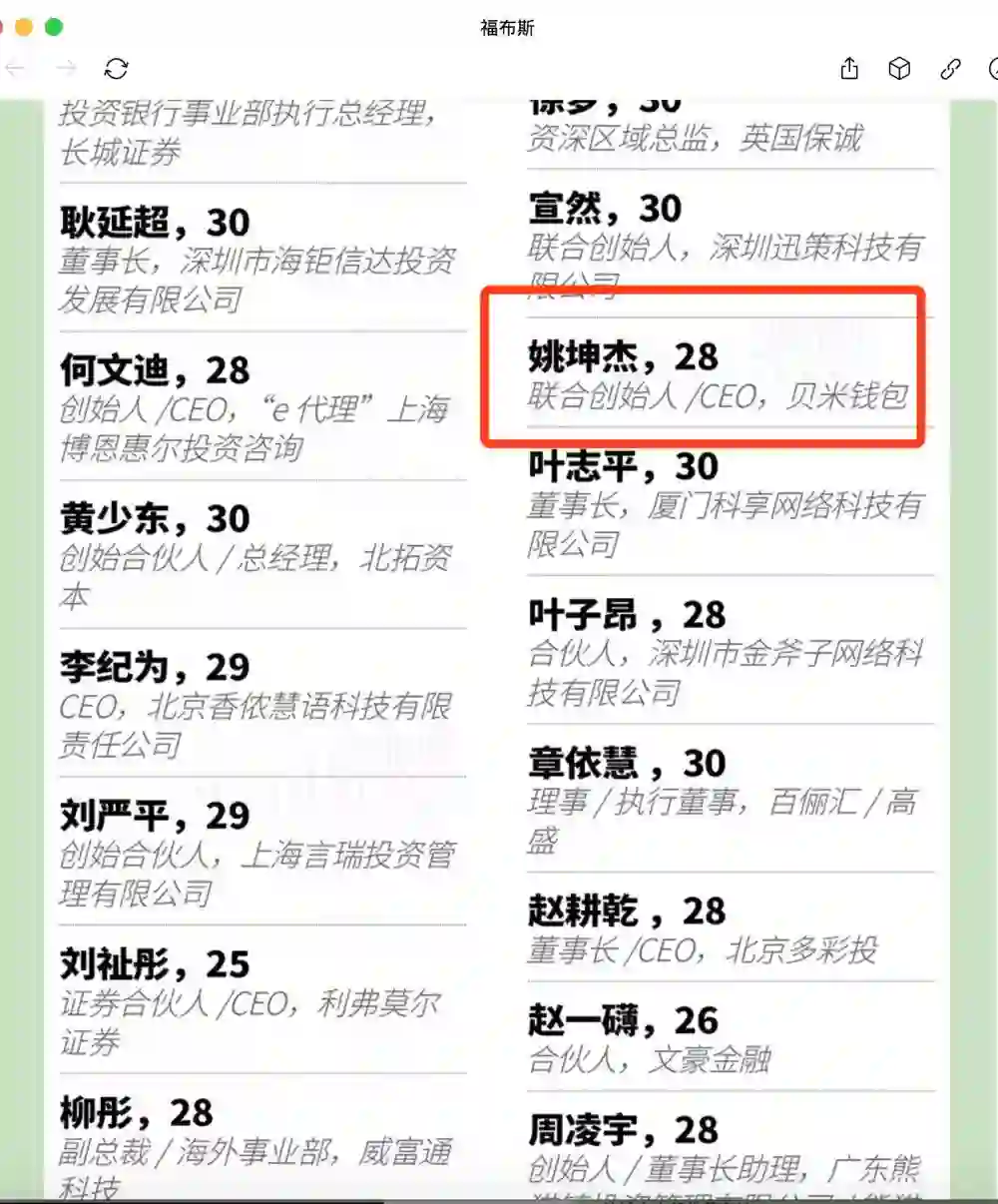 另外不得不说的是,最近的P2P爆雷炸得人心惶惶,其中就包括贝米钱包,涉及北京40多亿元未兑付,其CEO姚坤杰被取保候审。而戏剧性的是,这位被取保候审的CEO赫然出现在了福布斯今天的财务与金融板块的30岁以下榜单上。