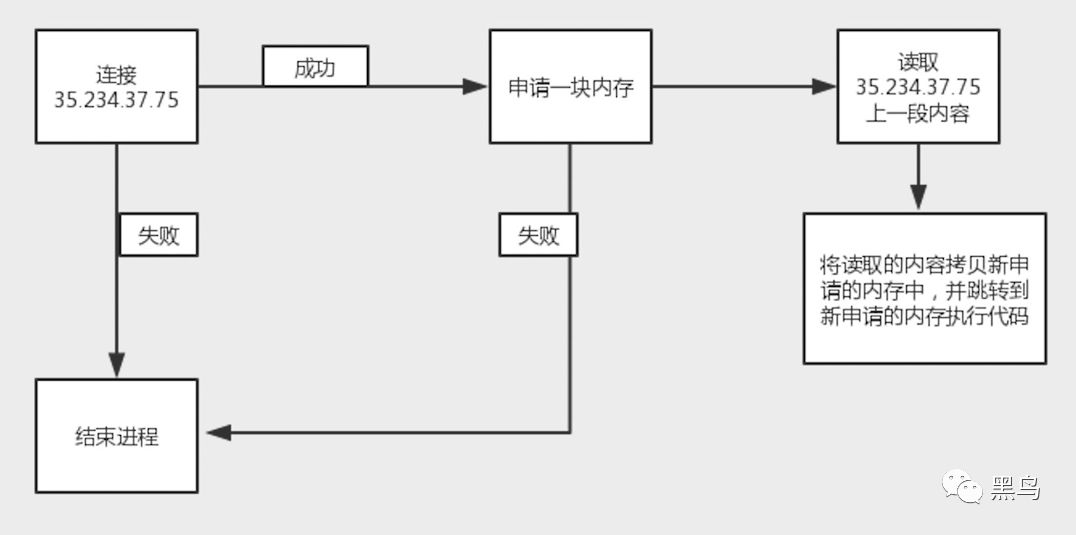 代码的主要作用为将一段加密的字符串通过 base64 解码后,再与’35’进行异或后解密,并在内存 中分配申请一段内存,将解密后的 shellcode 拷贝到新申请的内存中并执行,shellcode 不出现在 任何 PE 文件或者其他常见的攻击文件中,借此绕过杀软。