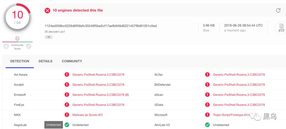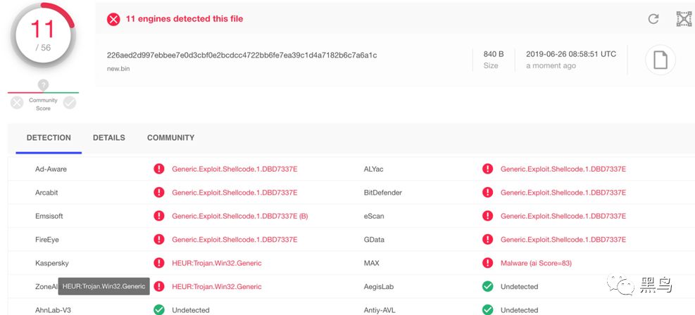 通过 virustotal 信息可以看到,国内所有杀软对此shellcode 文件都无检