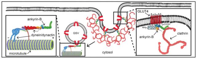 有的读者应该猜到了,是通过锚蛋白B呀!网格蛋白抓住细胞膜是通过锚蛋白B,动力蛋白复合体牵住囊泡还是通过锚蛋白B。锚蛋白B缺陷,内吞作用基本瘫痪,让GLUT4“功成身退”的专列开不起来,这些傻傻的看门人只能滞留在细胞膜上,还尽职尽责地噼里啪啦往细胞里放葡萄糖呢!