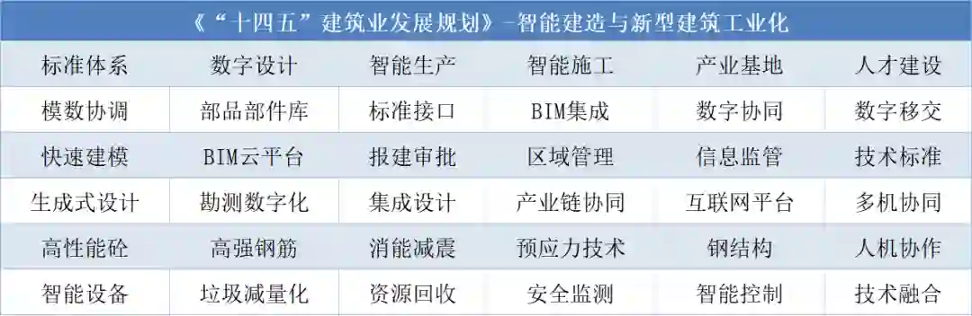 在发展规划中,智能化出现30次,BIM18次,装配式15次,数字化13次,初步对局部细节进行关键词凝练统计,可以得到这样一张确定的方向图。