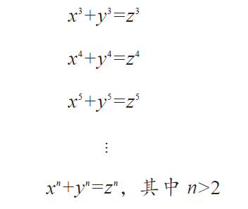 此外,当费马进一步提高x、y 和 z 的幂次时,他的求解努力一次又一次地碰壁。他开始觉得下列方程没有整数解: