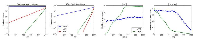 实证表明我们的 uRNN 能够更好地通过长序列传递梯度信息,并且不会遇到像 LSTM 一样多的饱和隐藏状态(saturating hidden states)。