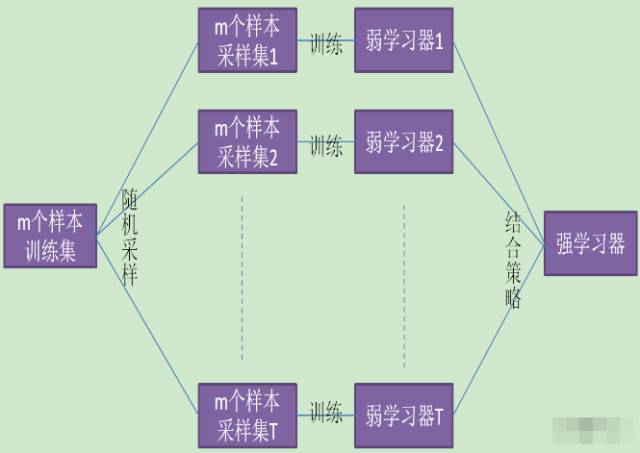 Bagging对于弱学习器没有限制,这和Adaboost一样。但是最常用的一般也是决策树和神经网络。Bagging的集合策略也比较简单,对于分类问题,通常使用简单投票法,得到最多票数的类别或者类别之一为最终的模型输出。对于回归问题,通常使用简单平均法,对T个弱学习器得到的回归结果进行算术平均得到最终的模型输出。由于Bagging算法每次都进行采样来训练模型,因此泛化能力很强,对于降低模型的方差很有作用。当然对于训练集的拟合程度就会差一些,也就是模型的偏倚会大一些。