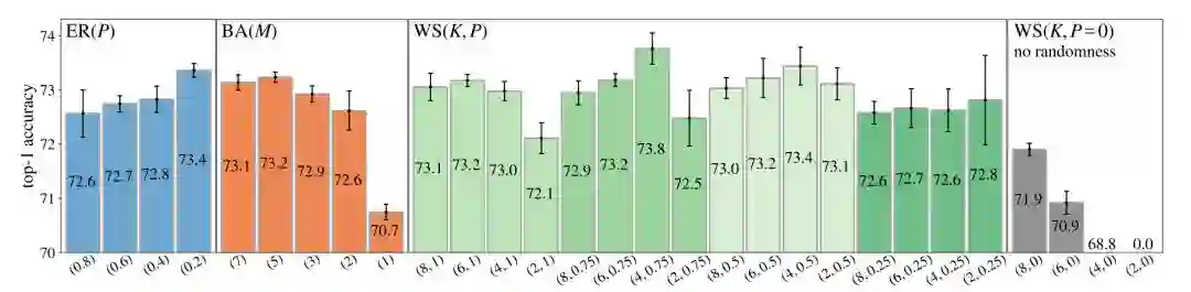 结果出人意料:这些随机生成器的几个变体在 ImageNet 上产生了准确率颇具竞争力的网络。使用 WS 模型的最佳生成器生成的多个网络性能优于或可媲美全手工设计的同类网络或通过各种神经架构搜索方法找到的网络。