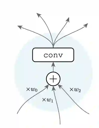 图 2. 随机图节点设计。这是一个节点(蓝色),有三个输入端和 4 个输出端,通过可学习的正权重 w_0、w_1、w_2 的加权来完成聚合。转换器是 ReLU-convolution-BN 三元组,可简单视作卷积。转换后的数据作为 4 份副本发送出去。