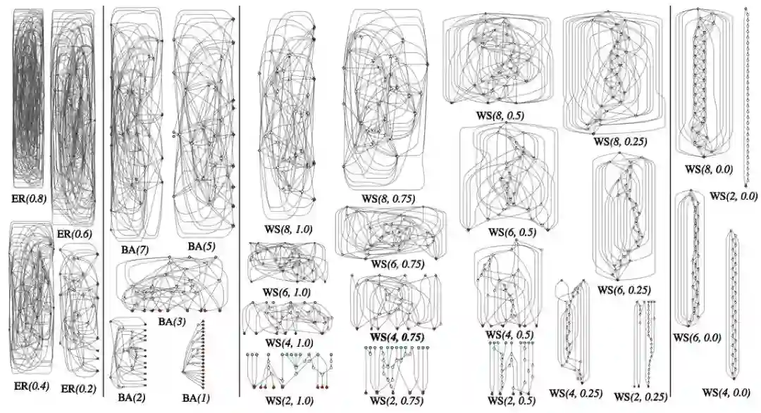 研究者注意到,这些随机连接网络并非「prior free」,即使他们是随机的。实际上,许多强先验(strong prior)被隐式地设计到生成器中,包括选择特定的规则和分布来控制连接或不连接某些节点的概率。每个随机图模型都具有一定的概率行为,使得采样的图可能具有某些属性(例如,WS 是高度聚集的)。生成器的设计最终决定了网络上的概率分布,因此这些网络往往具有某些特性。生成器的设计是先验的基础,因此不应被忽视。