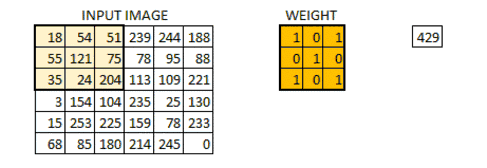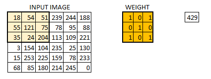 我们把权值初始化成一个 3*3 的矩阵。这个权值现在应该与图像结合,所有的像素都被覆盖至少一次,从而来产生一个卷积化的输出。上述的 429,是通过计算权值矩阵和输入图像的 3*3 高亮部分以元素方式进行的乘积的值而得到的。