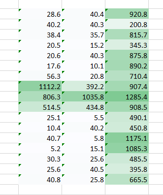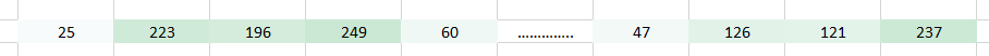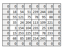 基本上,机器会把图像打碎成像素矩阵,存储每个表示位置像素的颜色码。在下图的表示中,数值 1 是白色,256 是最深的绿色(为了简化,我们示例限制到了一种颜色)。