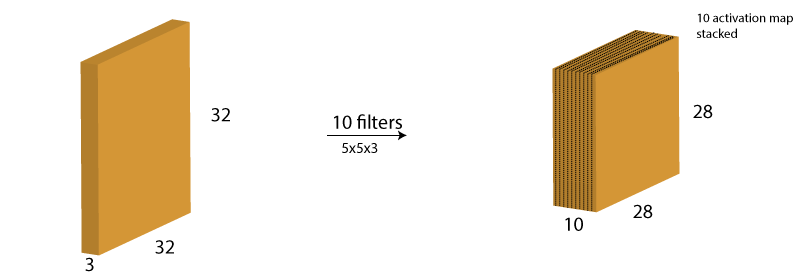 每一个过滤器的输出被堆叠在一起,形成卷积图像的纵深维度。假设我们有一个 32*32*3 的输入。我们使用 5*5*3,带有 valid padding 的 10 个过滤器。输出的维度将会是 28*28*10。