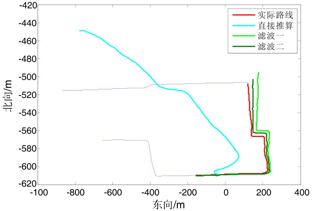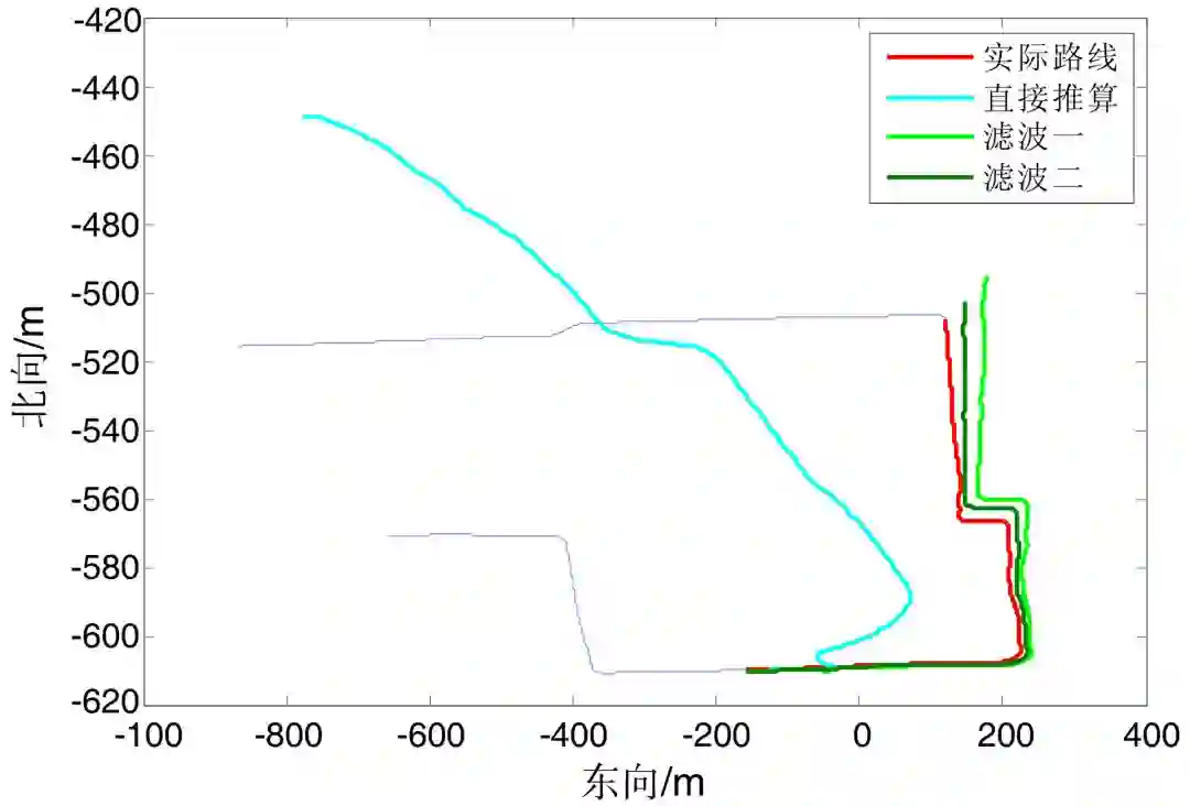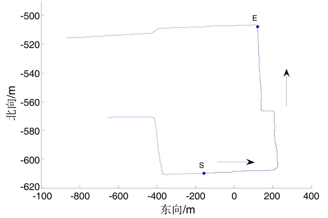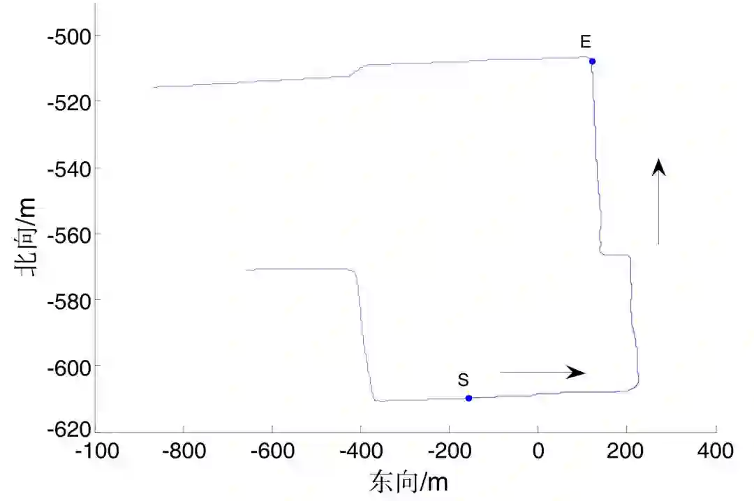 从图 4 中 S 点位置时开始通过MEMS惯导导航定位,终点为 E 点。在车辆静止时测量得到 mpu6050 的各轴加速度和角速度零偏,以 bu353 在 S 点输出的位置和速度为初始值进行推算。通过以下 3 种计算方式进行定位: