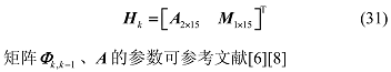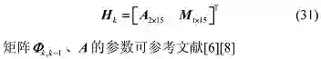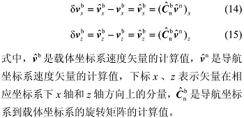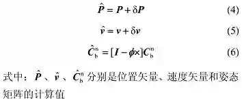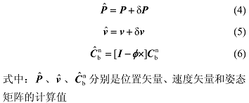 δP 是位置误差矢量;δv 是速度误差矢量;Φ 是姿态误差角矢量,Φ = [ Φ_x Φ_y Φ_z ]^T,Φ_x、Φ_y、Φ_z 分别为姿态误差角在 x、y、z 轴上的分量;Φ_x 是 Φ 的反对称矩阵;I 是 3 维单位矩阵。
