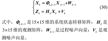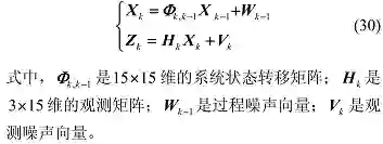 则可以建立误差状态系统模型,误差状态向量包含 15 个参数。系统误差向量 X 设为: