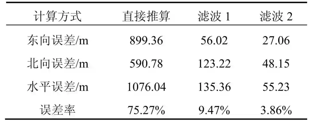 通过惯导输出数据直接推算定位在前 10s 具有较好的准确度,然而由于低成本 MEMS 惯导测量误差较大,10s 之后出现了快速的发散,200s 时定位误差率达到 75.46%。相对于直接推算,通过 Kalman 滤波进行定位的结果在 200s 内准确性较好。滤波 1 的定位误差率为 9.47%。增加了向心加速度差值的误差为观测量的滤波 2 定位误差率降为 3.86%,定位精度有较大提高。