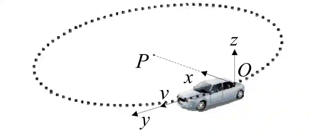 大多数车辆的转向轮为前轮,当车辆转向行驶时,车辆的瞬时运动可以看作是围绕后轮轴线上一点为圆心的圆周运动 [9]。当车辆直线行驶时,车辆运动也可以看作是曲率半径无限大的圆周运动。如图 2 所示,车辆载体坐标系原点 O 的速度方向与 y 轴平行,圆周运动的圆心 P 点在 x 轴轴线上。