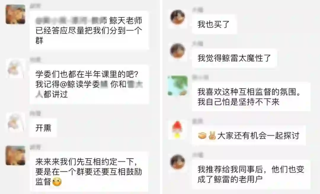 鲸雷计划为每一堂读书课都准备了一个高质量的书友社群,每一天听课以后,书友们都会针对刚刚听到的观点进行讨论,在讨论中交到好朋友(或者随便是什么奇怪的关系)的大有人在。