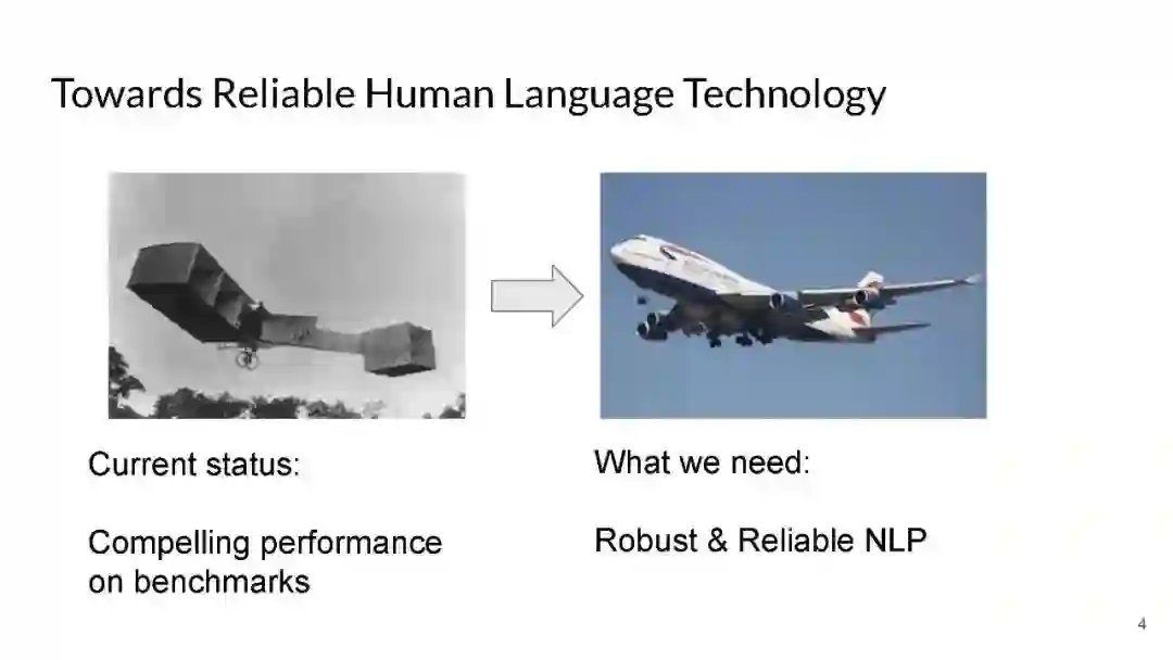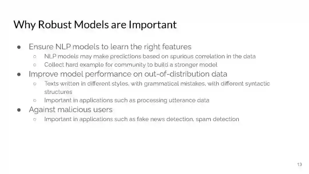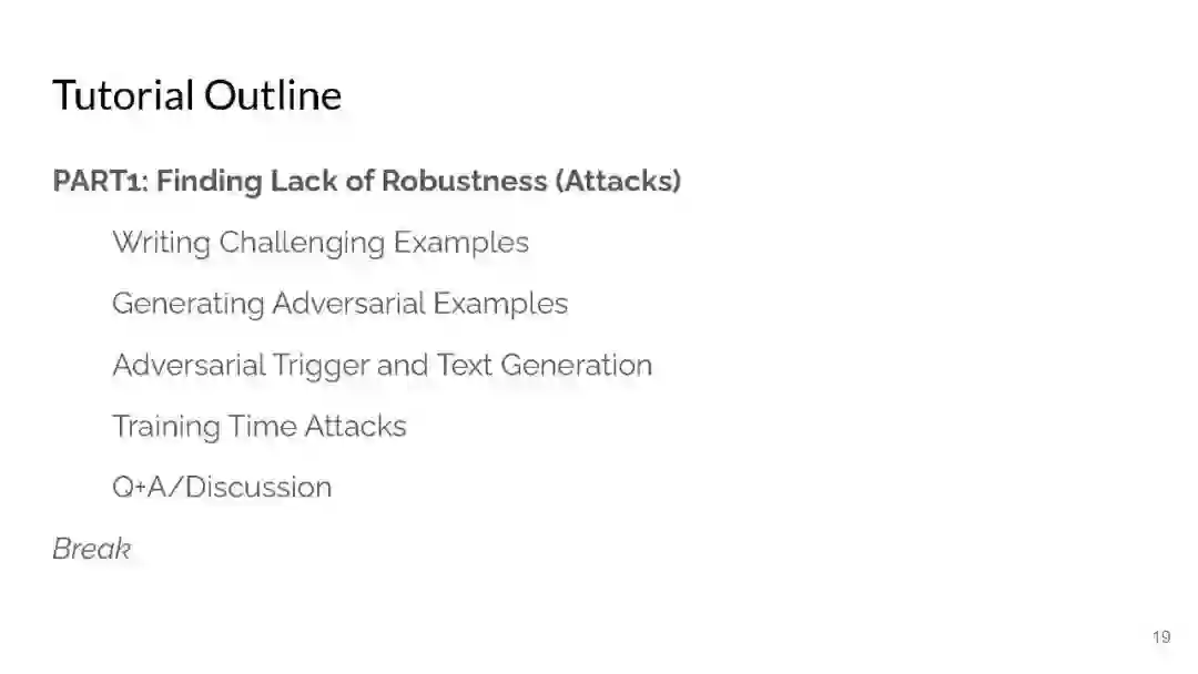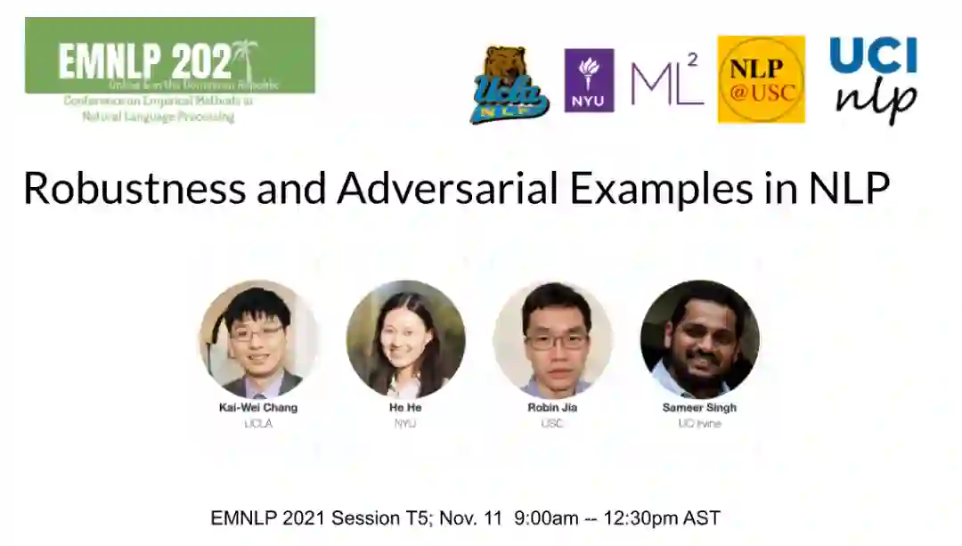 最近的研究表明,许多NLP系统对输入的微小扰动非常敏感和脆弱,并且不能很好地在不同的数据集上进行泛化。这种鲁棒性的缺乏阻碍了NLP系统在真实应用中的使用。本教程旨在让人们意识到有关NLP鲁棒性的实际问题。它的目标是对构建可靠的NLP系统感兴趣的NLP研究人员和实践者。特别地,我们将回顾最近关于分析NLP系统在面对对抗输入和分布转移数据时的弱点的研究。我们将为观众提供一个全面的视角