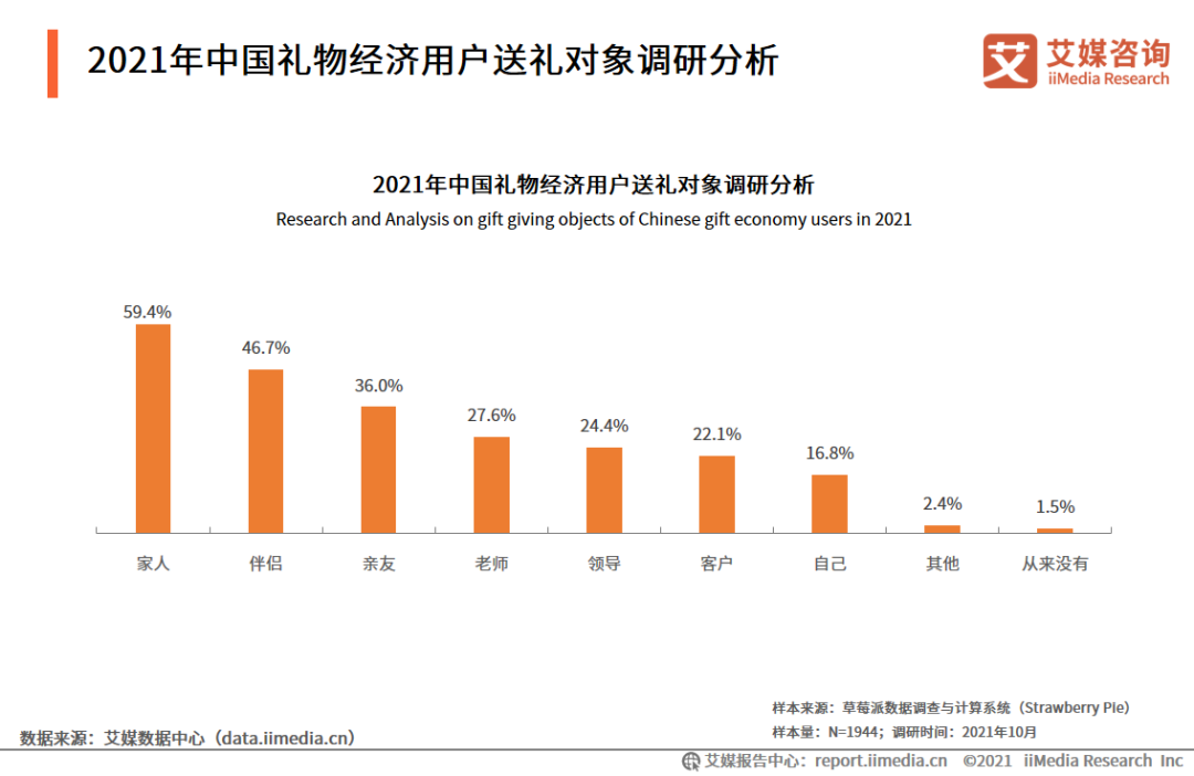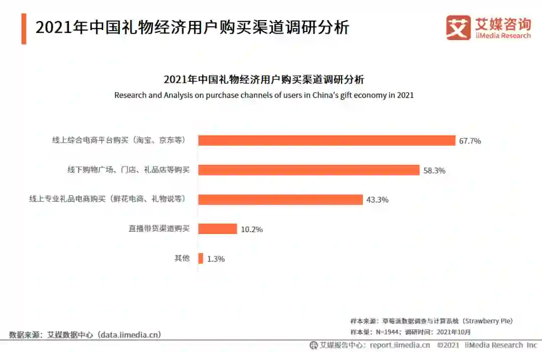 2021年用户购买礼物渠道以线上综合电商平台为主
