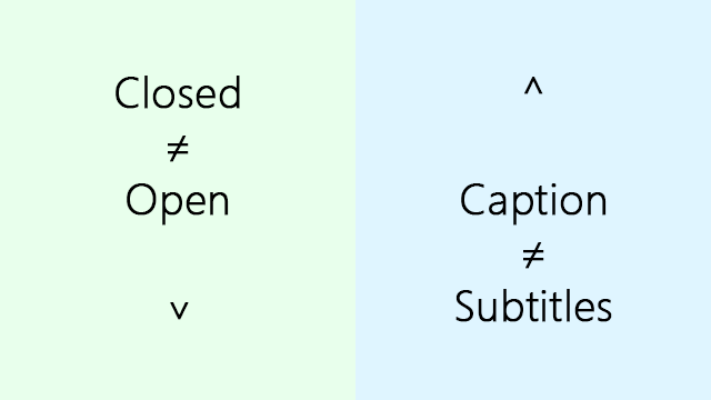 而 Closed 这个词更表明了它与 Subtitles 的另一个区别,与之相对的是 Open Caption 。Open Caption 在某些意义上比较类似于 Subtitles ,它随时都显示在那里向任何人提供, Closed 这个词的意义就在于,你可以用遥控器上的按钮随时打开或关闭字幕,或者有一个特定的按钮表示该字幕可以调整为显示或不显示,这样你就被给予了一个可选的字幕。