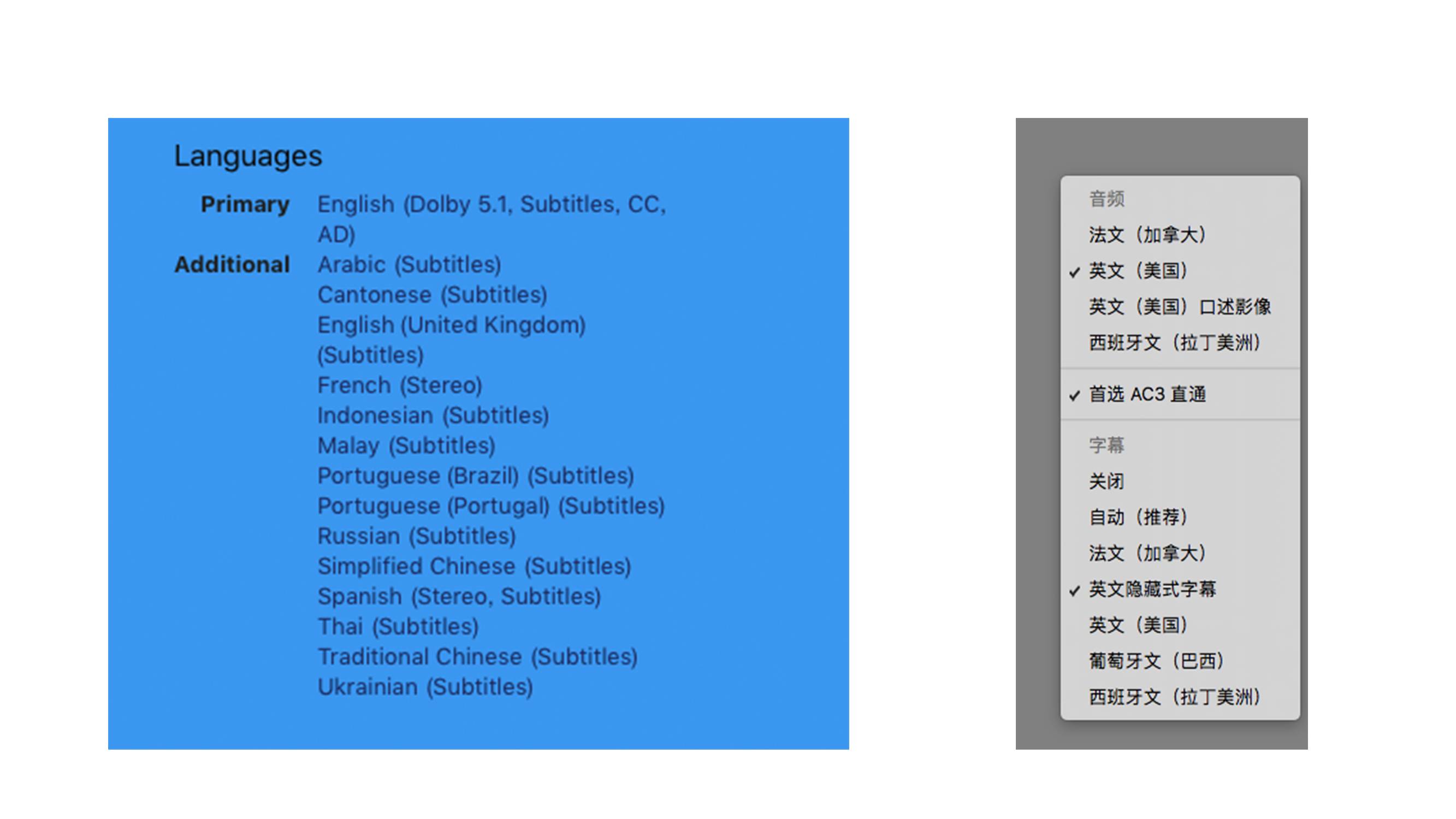 最新的蓝精灵电影在 iTunes Store 就提供了简繁中文和粤语的 Subtitles ,但不是 CC ,可以看到 Primary 英语提供 CC 和 AD 选项(后文介绍 AD )。右图中的《白日梦想家》在美国 iTunes Store 提供了加拿大式法文、西班牙文和英文音频,字幕则提供英语 CC 和法语、英语、葡萄牙语和西班牙语的普通字幕,普通字幕就与我们平时在电影上看到的是比较类似的,直接将文字盖在画面上。