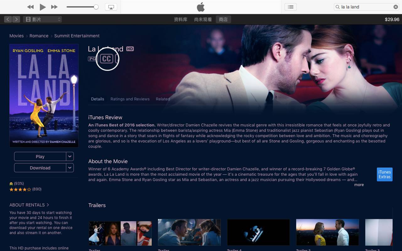 当你访问 iTunes 电影页面时,在影片名称下方除了分级,如果有 CC 标志则表明该电影伴随隐藏式字幕。