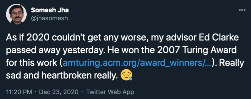 当 Clarke 去世的消息传来,曾经的学生、威斯康辛大学麦迪逊分校教授 Somesh Jha 在推特上说:「感觉 2020 年不会更糟糕了。」