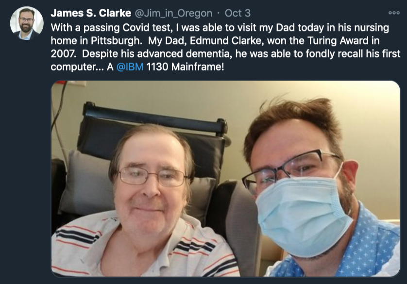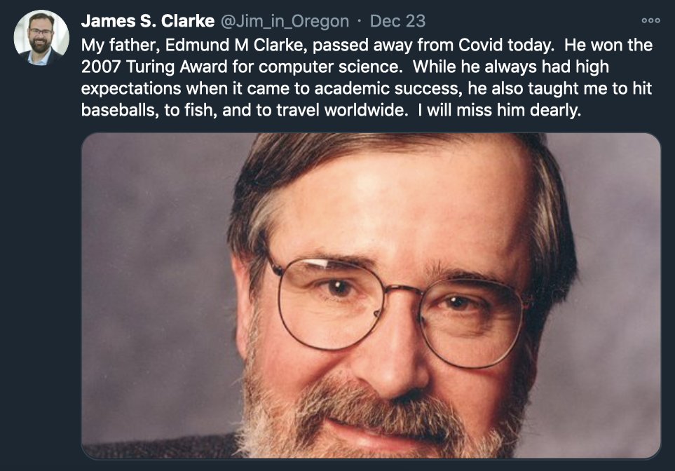12 月 23 日,英特尔量子硬件研究组总监 James S. Clarke 发文表示,他的父亲、2007 年图灵奖得主 Edmund M. Clarke 因感染新冠不幸去世,享年 75 岁。