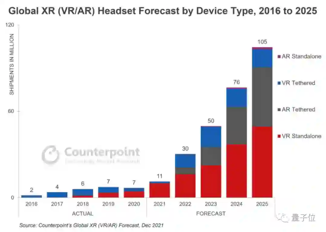 此外据Counterpoint预测,今年AR/VR头显的销量将会显著增加,到2025年出货数量将增加到1.05亿台,是2021年出货量的10倍。