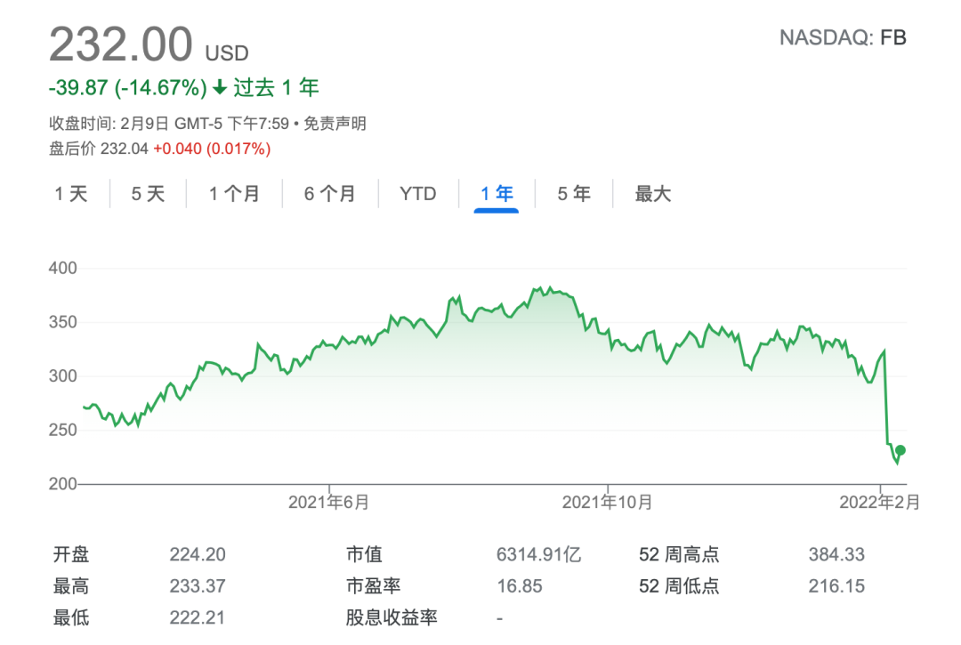 近日的Meta正遭受浩劫。2月3日公布最新财报后,Meta周三盘后股价暴跌21%,创下2012年该公司上市以来的最大单日跌幅,随后也一蹶不振,截至目前,一周时间Meta已经累积下跌35%,市值已经逼近6000亿美元。