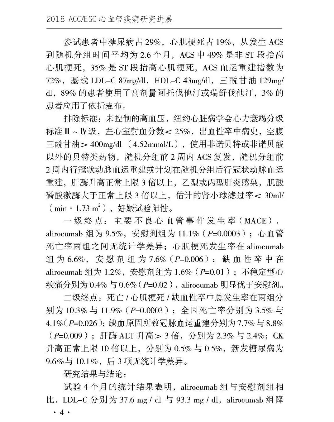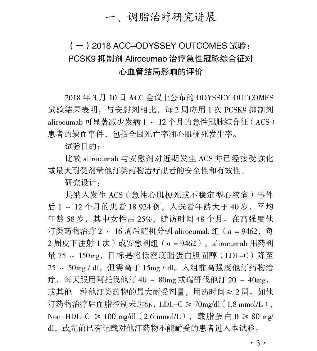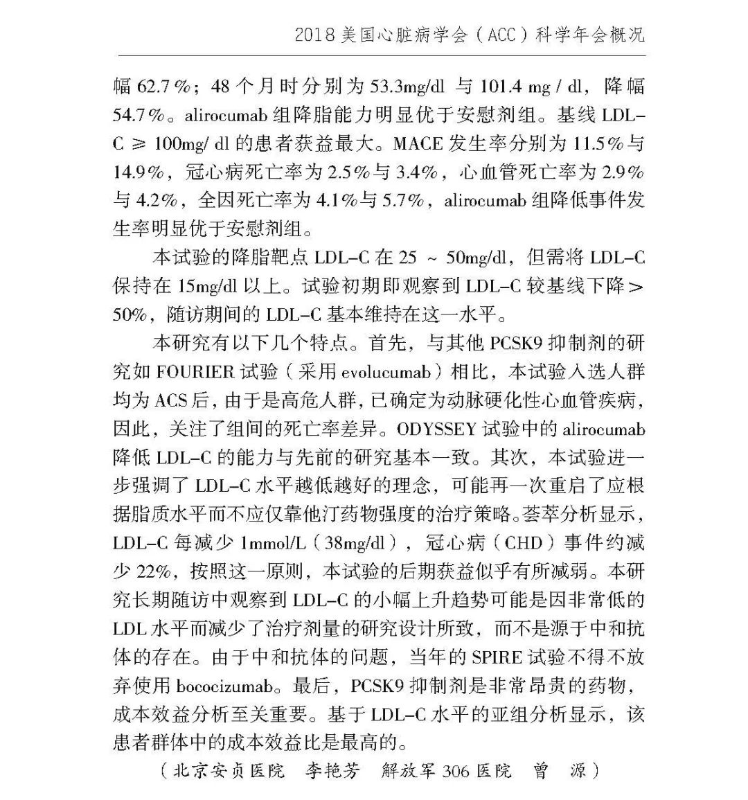 大会开幕式后,来自法国巴黎的P. Gabriel Steg 教授在会上报告了ODYSSEYOUTCOMES的试验结果。这是一项随机对照临床研究,比较了PCSK9 抑制剂alirocumab 和安慰剂对近期急性冠脉综合征患者临床终点的影响。ODYSSEY-CV 试验将LDL-C降至< 500mg/L(50mg/dl),较先前FOURIER 试验中的平均LDL-C更低。与安慰剂相比,alirocumab 减少了主要不良心血管事件、心肌梗死和缺血性卒中,降低了全因死亡率,而且在参试者中显示出较好的安全性和耐受性。